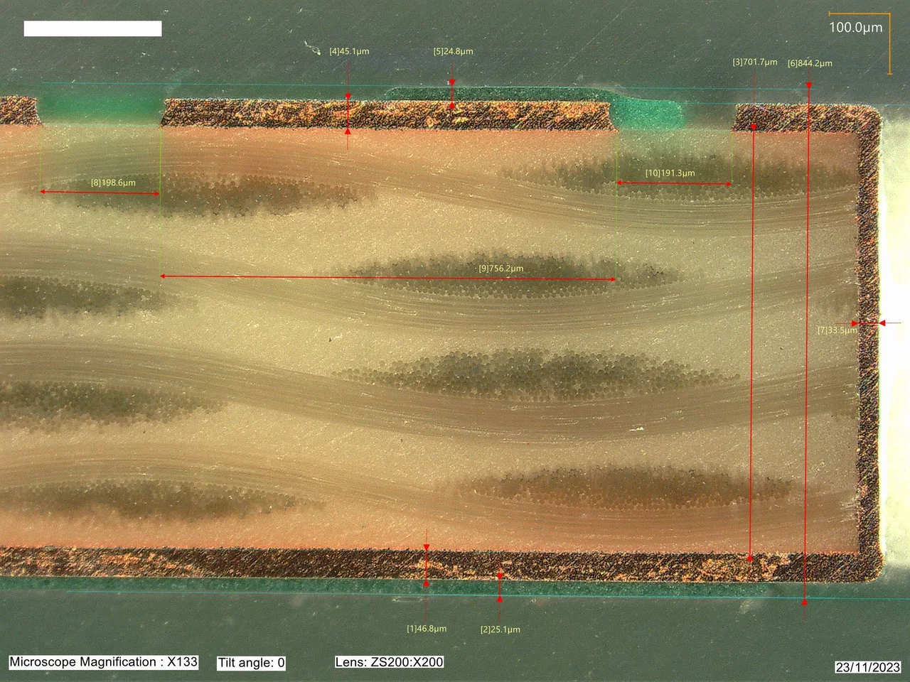Die optische Detailauflösung der Schliffe liegt auf Grund der sorgsamen Verarbeitung und der verwendeten Mikroskope bei rund 800nm. Darunter verwenden wir Elektronenstrahlmikroskopie.